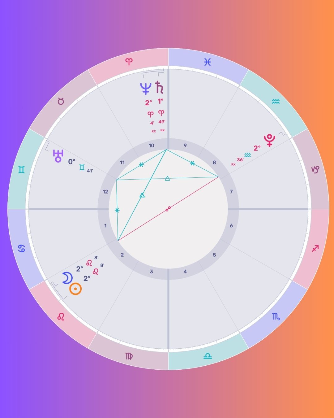 The challenge in this configuration is the opposition connecting the Sun / Moon, at 2 degrees of Leo with Pluto at 2 degrees of Aquarius. The harmonious trines and sextiles between Saturn, Neptune and Uranus offer support and stability.